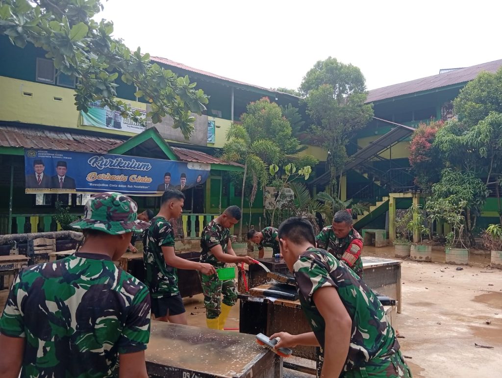 Tapanuli Tengah, Nusantara Bicara — Satgas Penanggulangan Bencana Alam (Gulbencal) Kodam I/Bukit Barisan bersama para guru melaksanakan pembersihan lingkungan MIN 7 Sibuluan Nalambok, Kecamatan Sarudik, Kabupaten Tapanuli Tengah, Rabu (4/2/2026), guna memulihkan kondisi sekolah pascabanjir dan tanah longsor agar kembali layak digunakan untuk Kegiatan Belajar Mengajar (KBM).