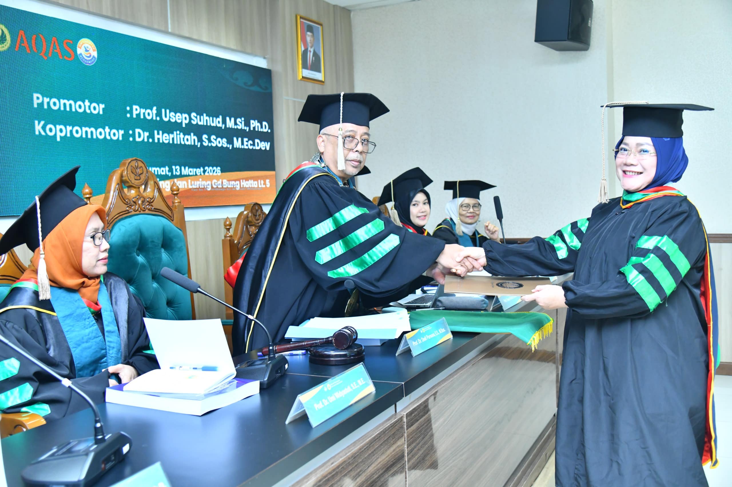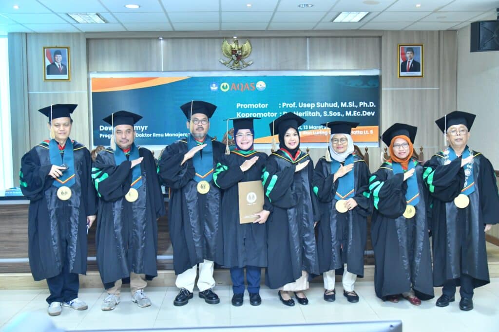 Sidang terbuka tersebut dipimpin oleh Ketua Sidang Prof. Dr. Dedi Purwana, E.S., M.Bus., bersama tim promotor dan penguji dari Sekolah Pascasarjana UNJ.