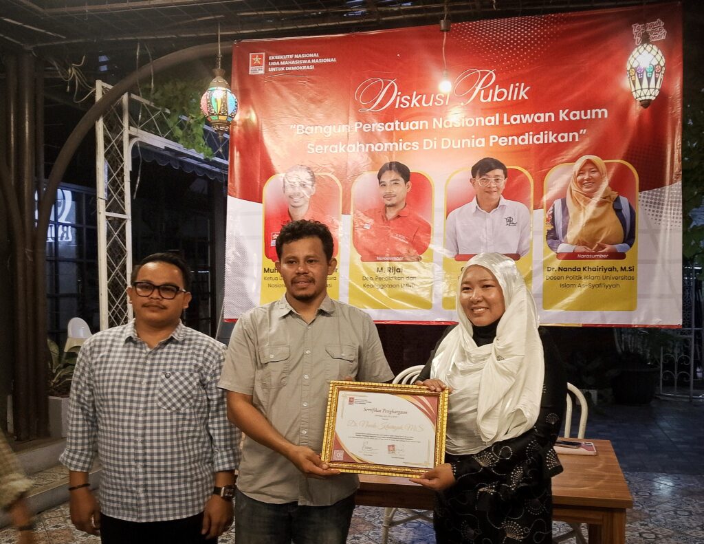Diskusi menghadirkan empat narasumber, yakni Ketua Umum Liga Mahasiswa Nasional untuk Demokrasi (LMND) Muh. Isnain Mukadar, M. Rijal dari Divisi Pendidikan dan Keanggotaan LMND, akademisi Gede Sandra, serta dosen Ilmu Politik Dr. Nanda Khairiyah, M.Si.