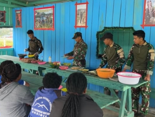 melaksanakan kegiatan pembinaan teritorial dengan mengajak Ibu-ibu di sekitar Pos untuk mengikuti pelatihan pengolahan ubi menjadi sushi,pada Rabu (08/04/2026). Kegiatan ini menjadi salah satu inovasi baru yang diperkenalkan prajurit TNI kepada masyarakat Pegunungan Bintang, khususnya di Wilayah Oksibil.