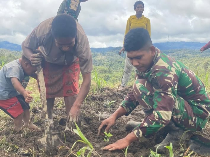 dengan penuh semangat mengikuti arahan yang diberikan dan turut berpartisipasi aktif dalam setiap tahapan penanaman. Kebersamaan yang terjalin antara prajurit dan masyarakat mencerminkan hubungan harmonis yang terus dibangun melalui kegiatan teritorial yang bermanfaat langsung bagi warga.