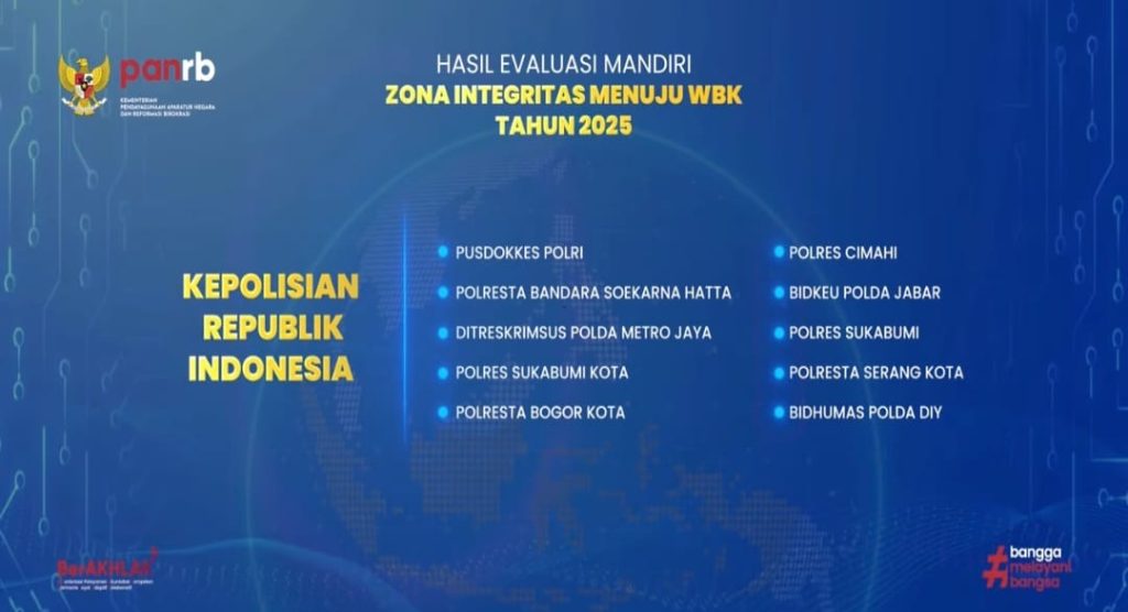 Sementara itu, sejumlah satuan kerja Polri lainnya juga mendapatkan predikat Zona Integritas Menuju WBK Tahun 2025, di antaranya Bidkeu Polda DIY, Jambi, Papua Barat, dan Jawa Barat.